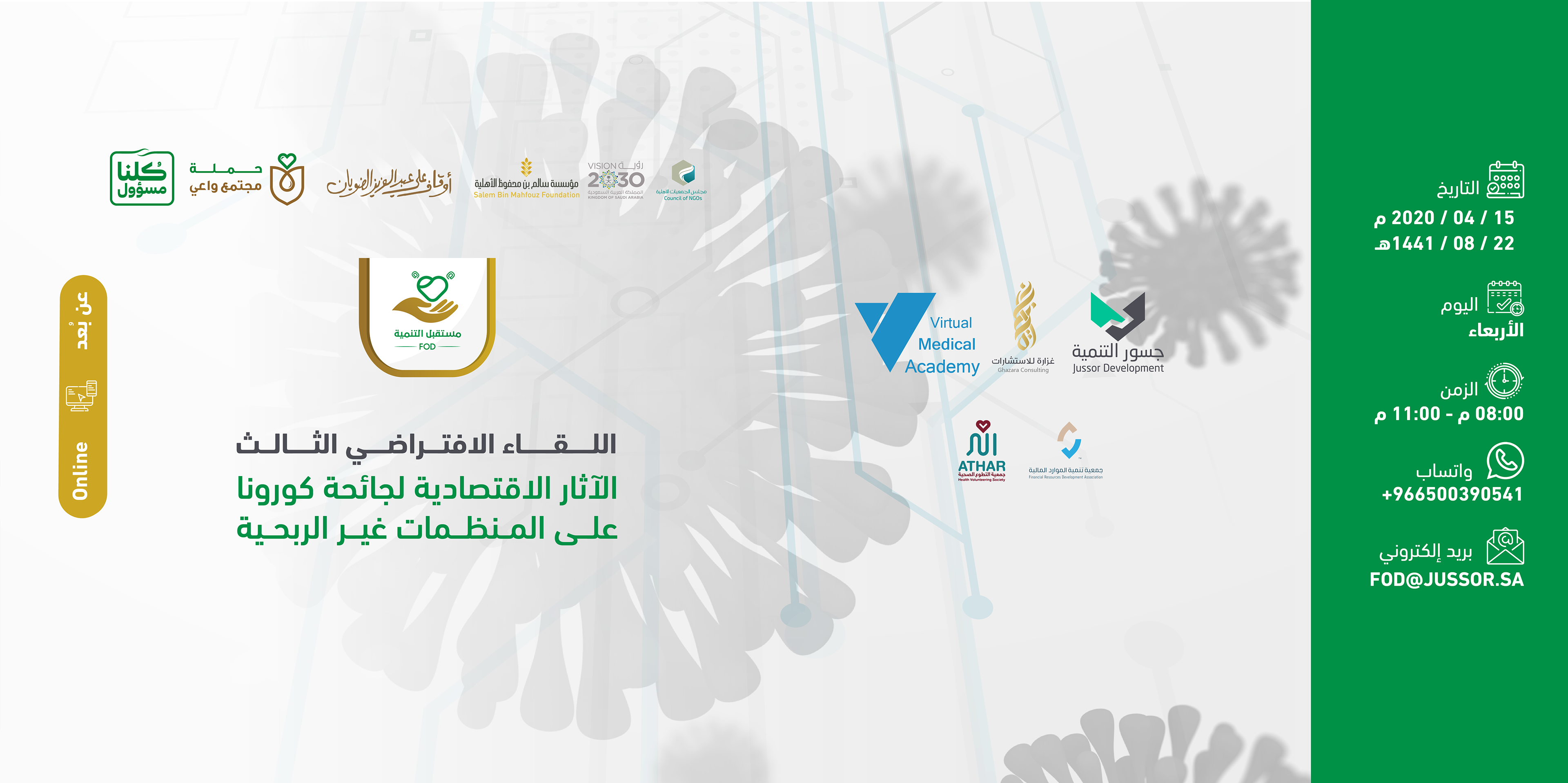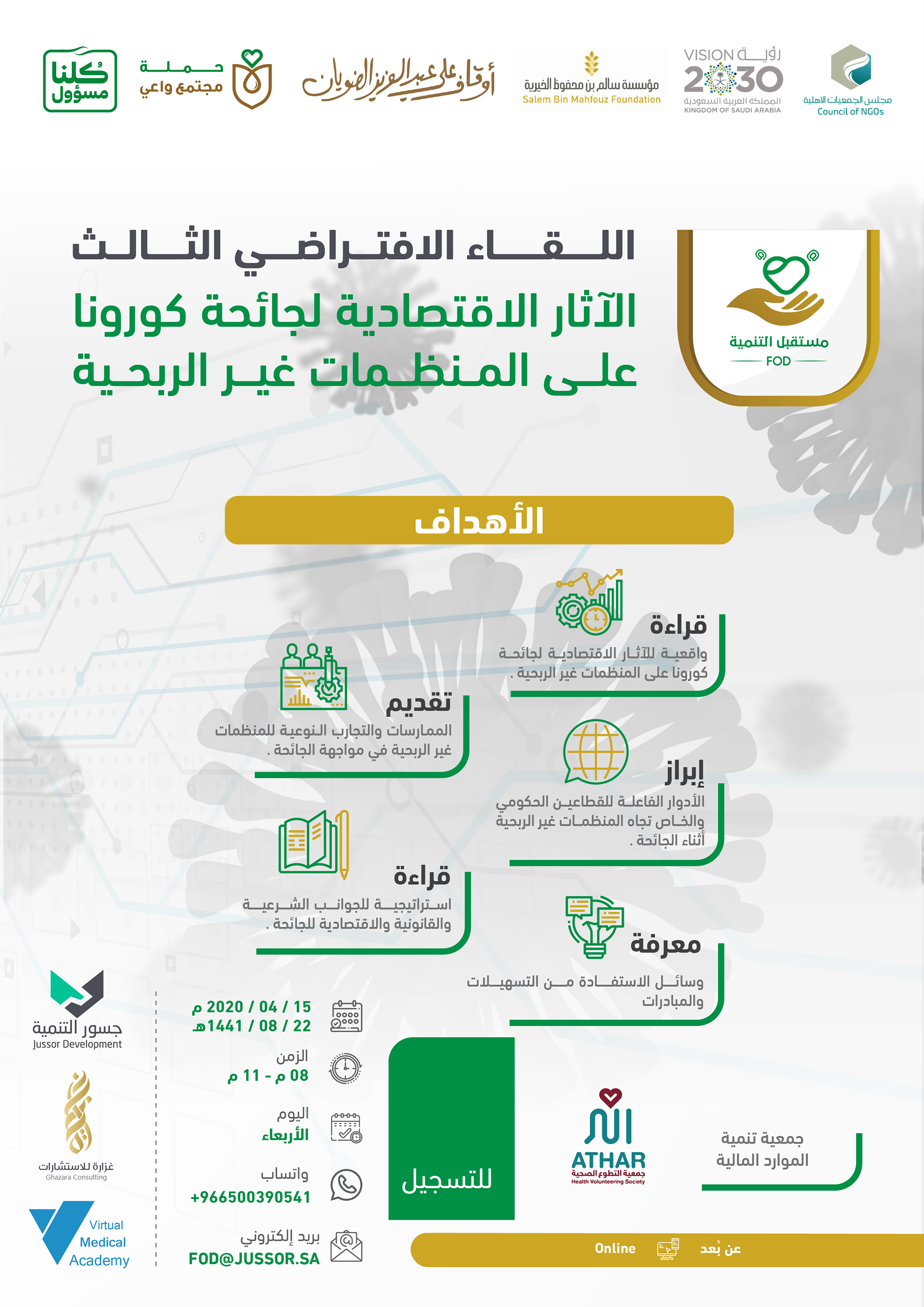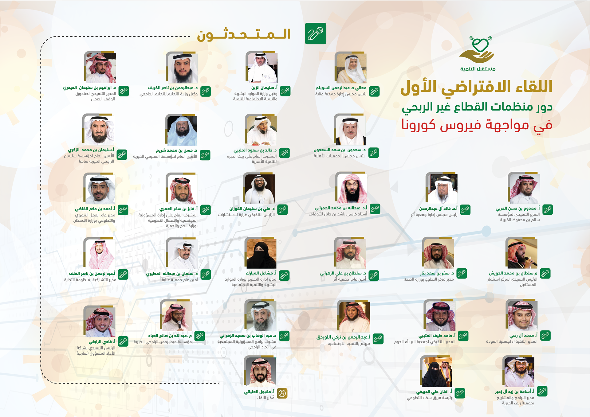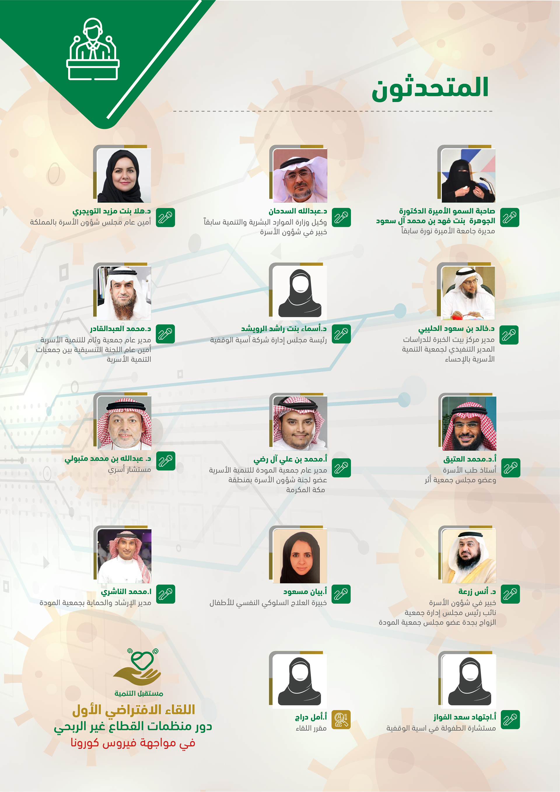 لقاء اليكتروني تم عن طريق برامج اجتماعات افتراضية وقد ضم نخبة من المستشارين والمتخصصين كما شمل عدد من الجهات المشاركة