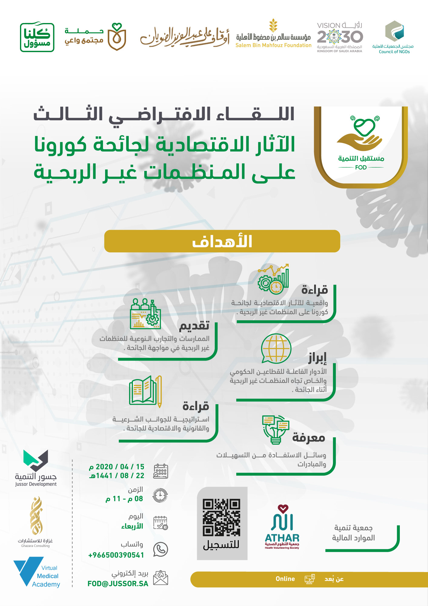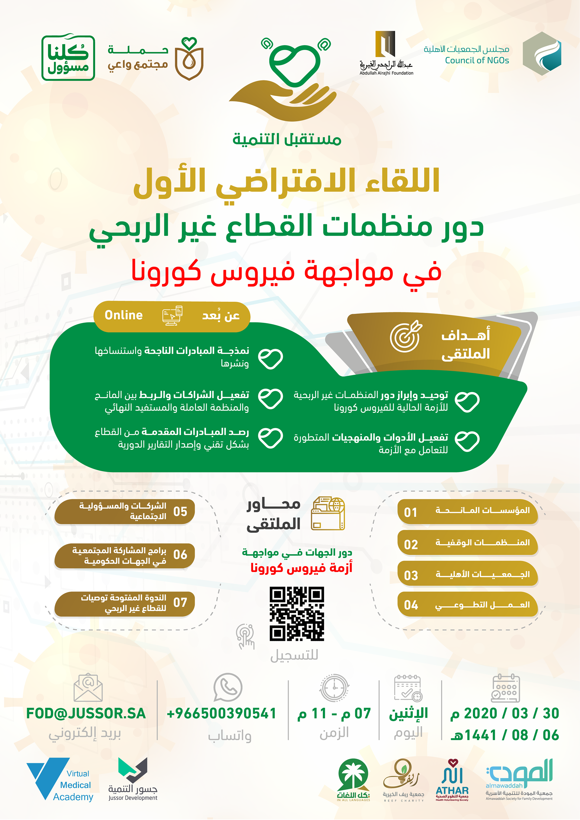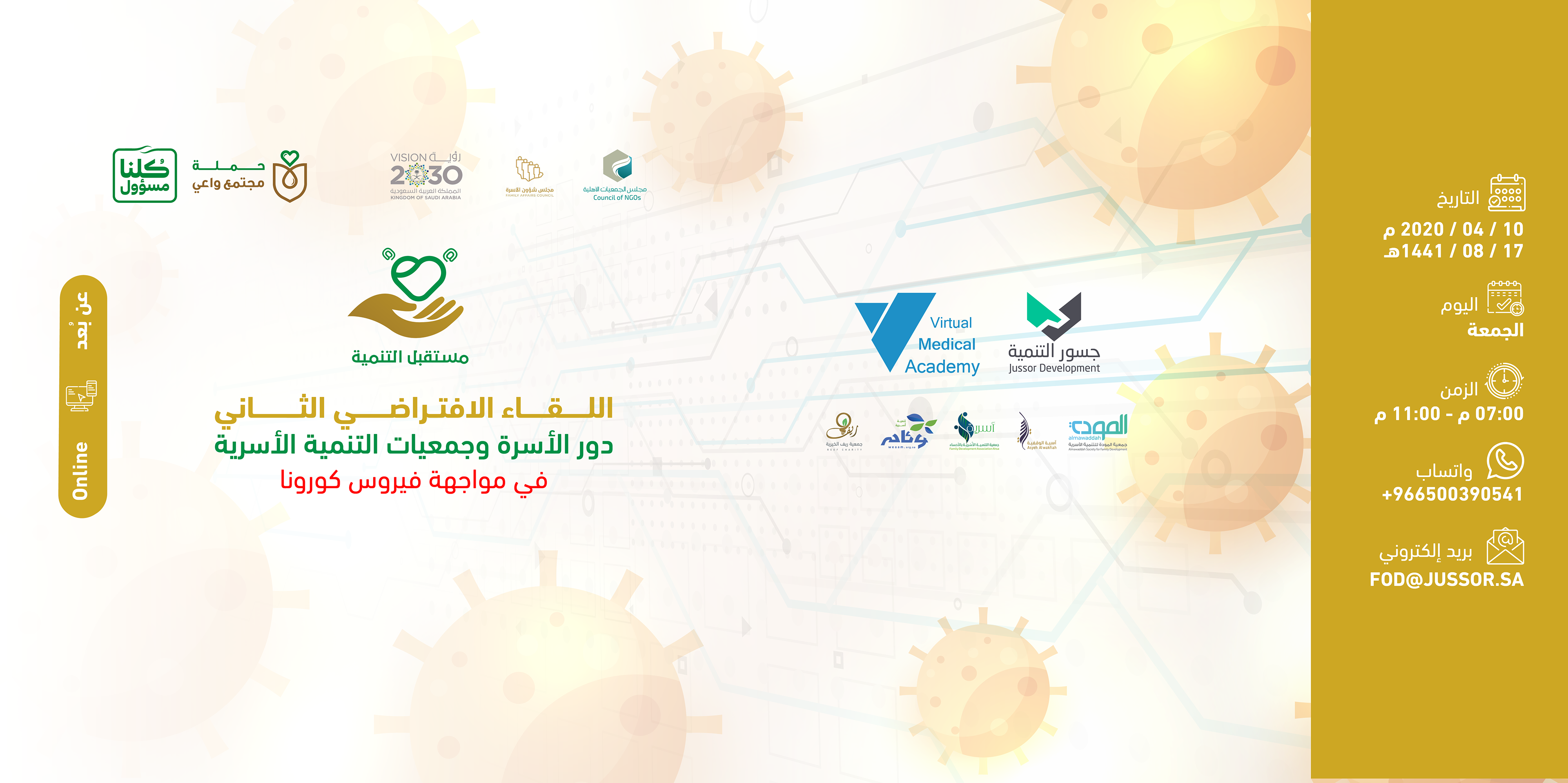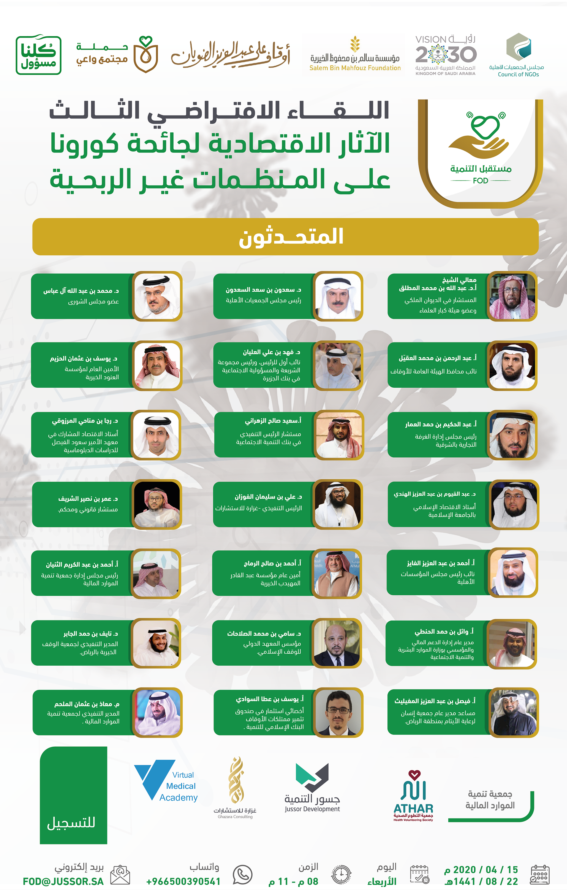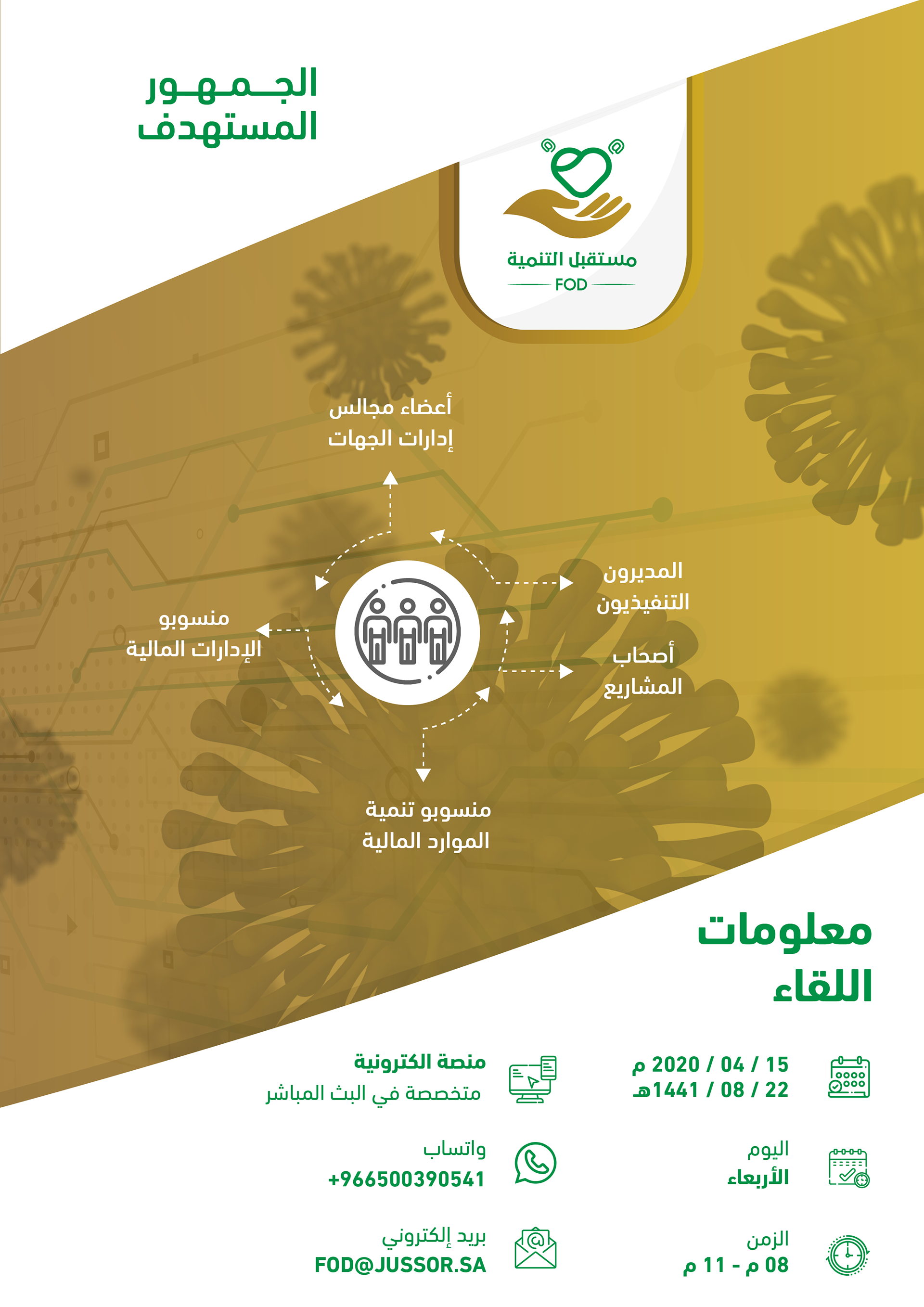 لقاء اليكتروني تم عن طريق برامج اجتماعات افتراضية وقد ضم نخبة من المستشارين والمتخصصين كما شمل عدد من الجهات المشاركة